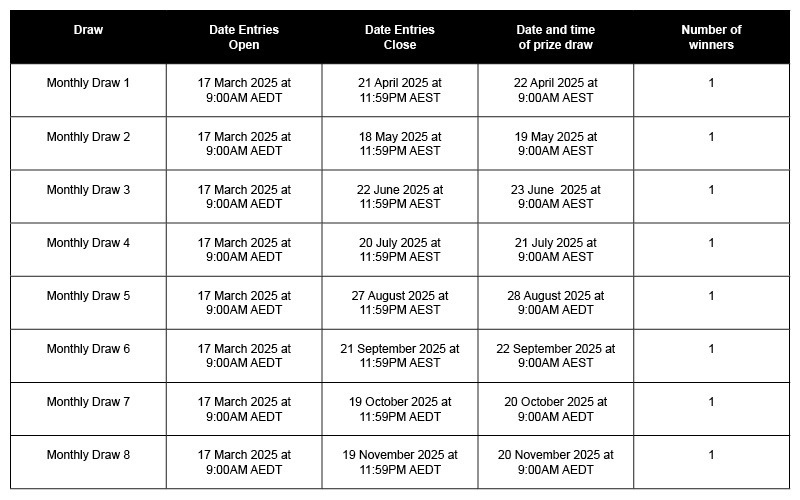 Entries into the promotion open at 12:01AM AEDT on 17 March 2025 and close at 11:59PM AEDT on 8 January 2026 (“Promotional Period”).
